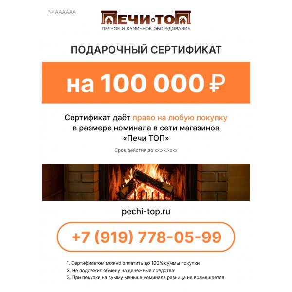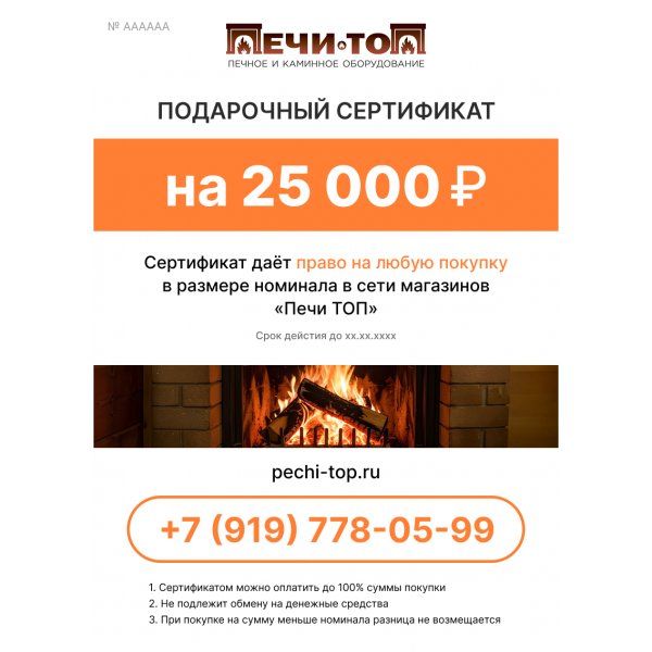 Подарочный сертификат «Печи ТОП» представляет собой документ, подтверждающий право на оплату товаров в магазинах сети «Печи ТОП» на указанную сумму.