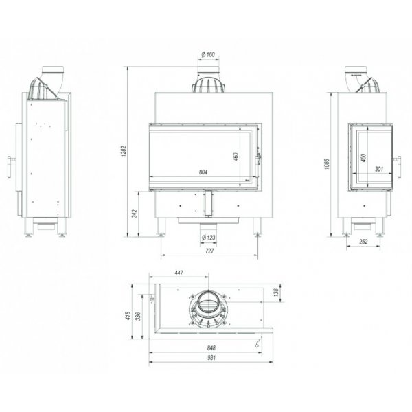 - вторичный дожиг, встроенные ножки, система чистое стекло, подача воздуха извне, декоративное исполнение